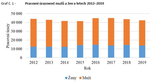 Celková úrazovost (bez rozdílu pohlaví úrazem postižené osoby) klesla o 1 949 pracovních úrazů. Pracovní úrazovost žen za loňský rok klesla o 542 úrazů, a to z 14 389 úrazů žen v roce 2018 na 13 847 úrazů v roce 2019. Z celkového počtu zaznamenal ČBÚ 30 pracovních úrazů žen. Ženy se trvale na počtu pracovních úrazů podílejí daleko méně, nežli by odpovídalo jejich podílu na celkové zaměstnanosti v České republice, což souvisí s charakterem vykonávané práce.
