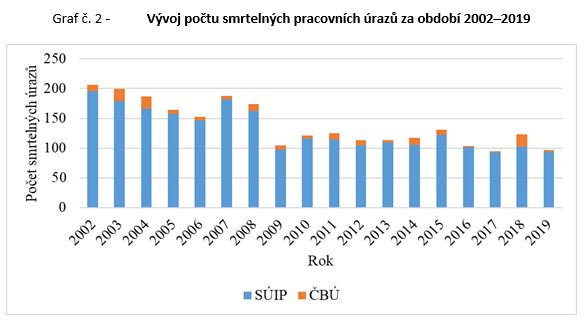 Vzhledem k závažnosti smrtelných  pracovních úrazů uvádíme pro srovnání delší časovou řadu. Od roku 2002, kdy jich bylo celkem 206, se jejich počet snižoval až na 152 smrtelných pracovních úrazů v roce 2006. V letech následující hospodářské konjunktury opět počet smrtelných pracovních úrazů o něco vzrostl, ovšem vzápětí v roce 2009 výrazně klesl na 105 případů. V následujících letech se pohyboval mezi 110–120 případy. V roce 2016 klesl na 104 případů a v roce 2017 dokonce na 95 případů. V roce 2018 byl zaznamenán nárůst na celkový počet 123. V roce 2019 počet smrtelných úrazů poklesl na 95.