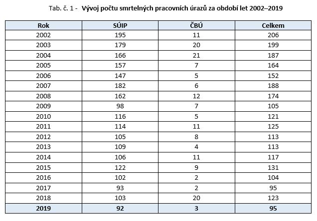 V roce 2019 zaznamenal SÚIP 92 smrtelných pracovních úrazů a ČBÚ 3 smrtelné pracovní úrazy, což znamená výrazný pokles oproti roku předchozímu, kdy došlo k 123 takovým úrazům. Nejvíce těchto úrazů se v roce 2019 stalo v krajích Jihomoravském, Středočeském a Hl. městě Praze.